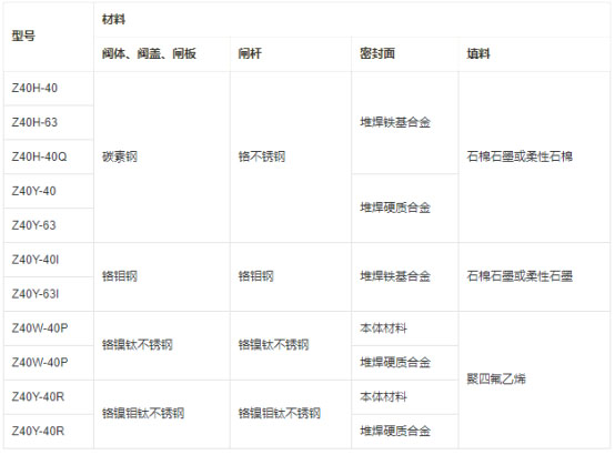 Z40H、Z40Y、Z40W 型 PN40、PN63 鋼制楔式閘閥零部件材料表: