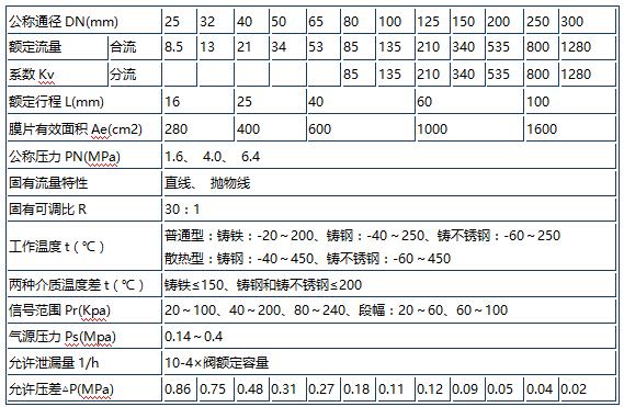 ZJHH、ZJHF型氣動薄膜三通合流調(diào)節(jié)閥技術(shù)參數(shù):