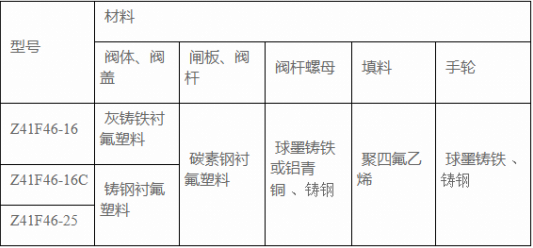 Z41 F46-10 16C襯氟閘閥零部件材料表: